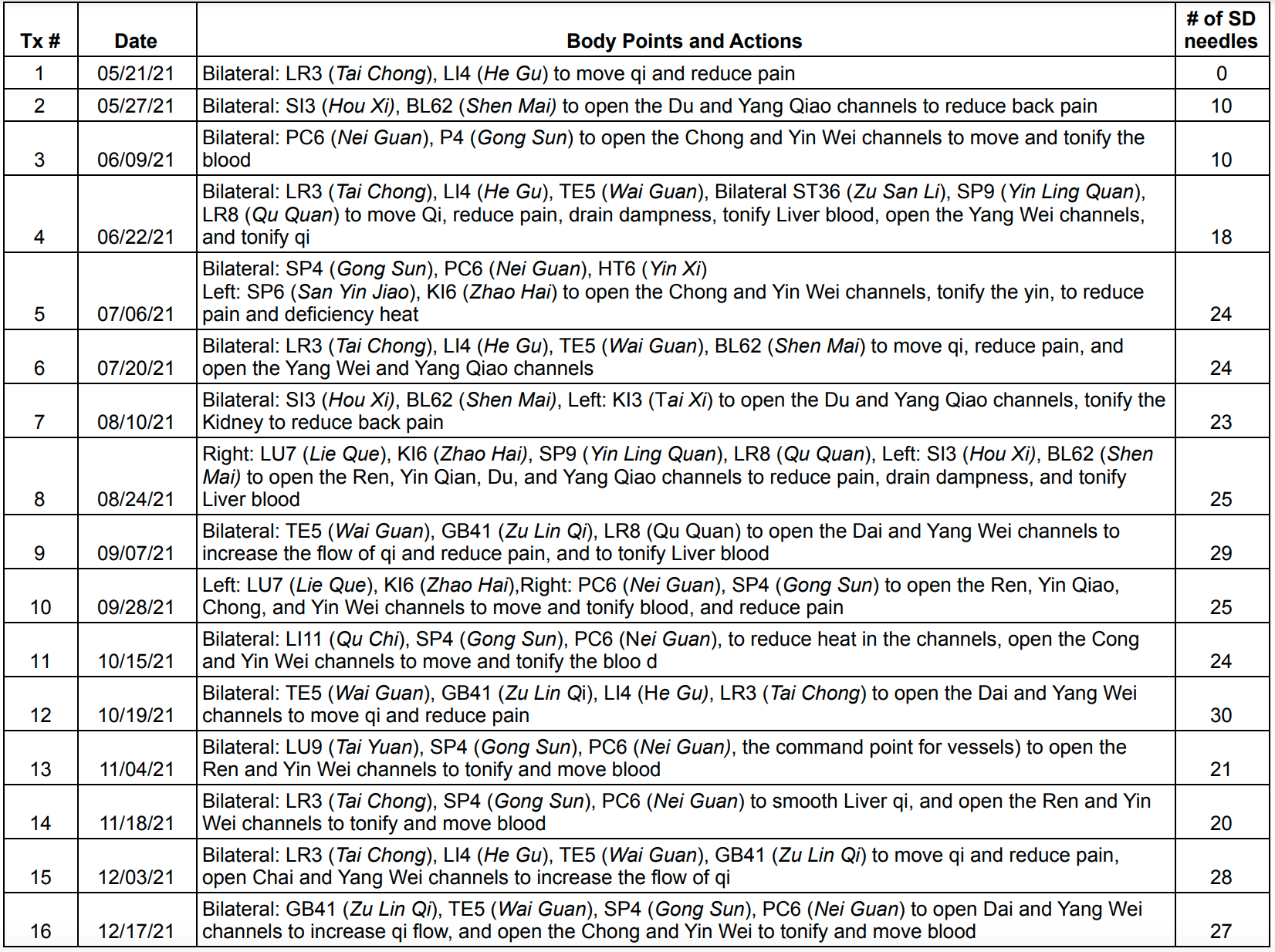 DBC Spring Ten needles length 30 mm, gauge .20 mm were used. Body Point combinations included: LR3 (Tai Chong) and LI4 (He Gu), SI3 (Hou Xi) and BL62 (Shen Mai), PC6 (Nei Guan), and SP4 (Gong Sun). Choice of body points varied based on pulse assessment and pain levels. The SD technique required between 10 and 30 needles per session. (See Table 1.)