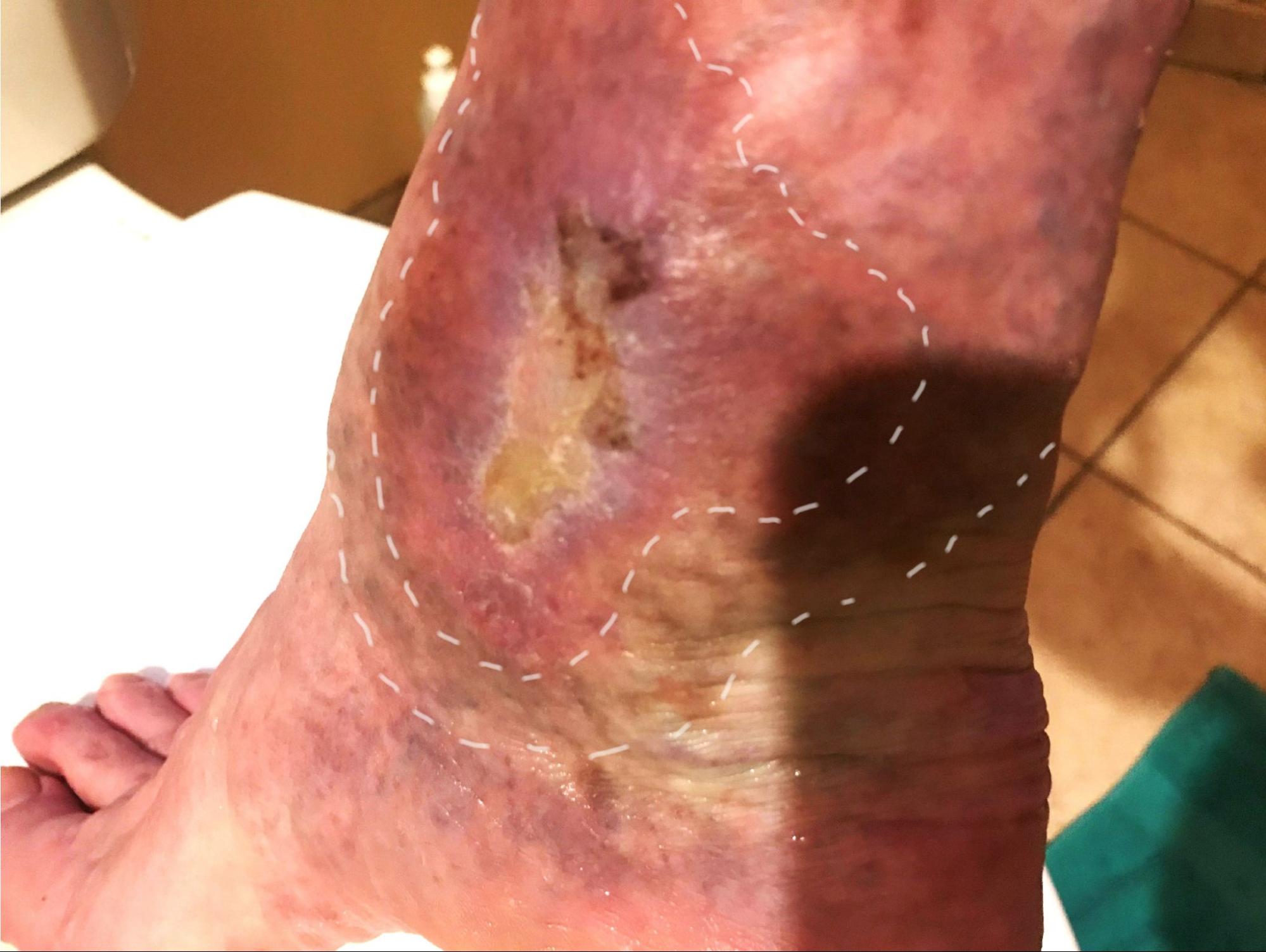 GM was seen at a hospital wound care facility for two years prior to coming in for acupuncture. He had success at the wound care facility with a significant part of the wound healing, but a small part of the affected region would periodically open. As a result, the wound never completely healed. A large part of the problem was a warehouse job requiring GM to stand on cement floors and walk several miles per day. In addition, he had a welding business and was remodeling his cabin. He worked 16 or more hours per day in work boots rubbing on the affected area. He wore double layers of socks and bandages to prevent the sore from opening, but it did not always help.
