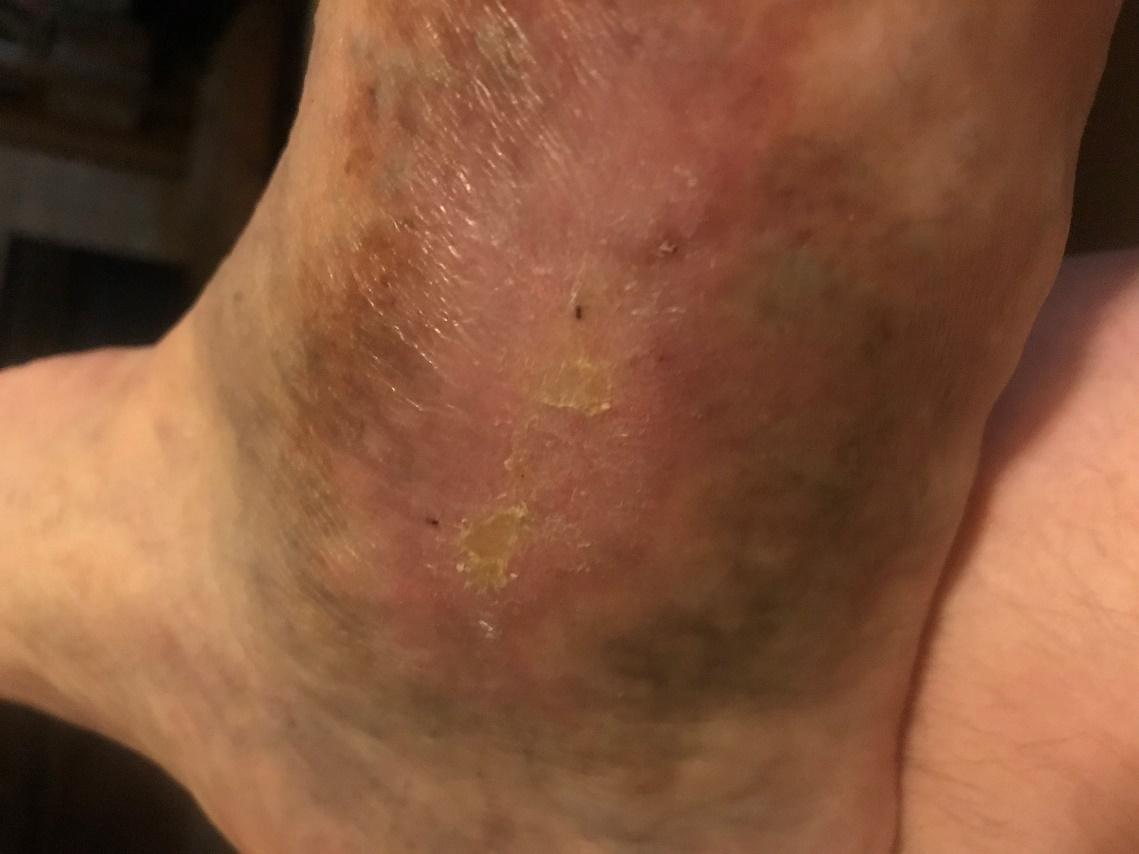 GM’s pulse diagnosis was wide, soft, slippery, and deep bilaterally at all three positions. His tongue was not observed due to Covid-19 precautions. The patient wore a mask during the entire appointment. He was also wearing compression stockings and reported that this helped keep the swelling and pain down. Stockings were removed prior to examination. There was no bandage over the wound during the exam, but the patient described the layers of bandaging needed to keep the wound protected.