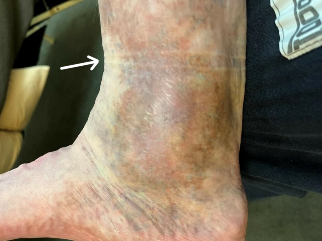 Using the location, depth, and appearance of the wound, specifically the signs of edema and hemosiderin staining on GM’s leg, he was diagnosed as having a venous wound type. This mandated increased precautions for safe acupuncture practice. The hemosiderin staining is seen clearly in Figures 1 and 2. Figure 4 shows the texture of the compression sock due to localized edema. Figure 4 shows the reduction of inflammation and hemosiderin staining since the first treatment.