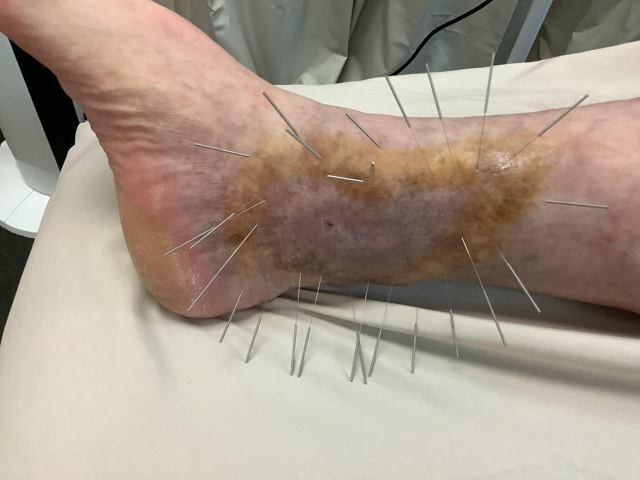 The SD technique involves inserting multiple acupuncture needles obliquely around the margins of a wound with the tips pointing toward the center. SD was the technique applied to the non-healing wound in this case report. (See Figure 7.)