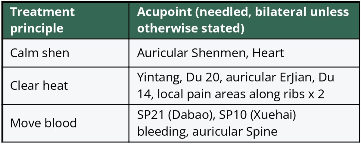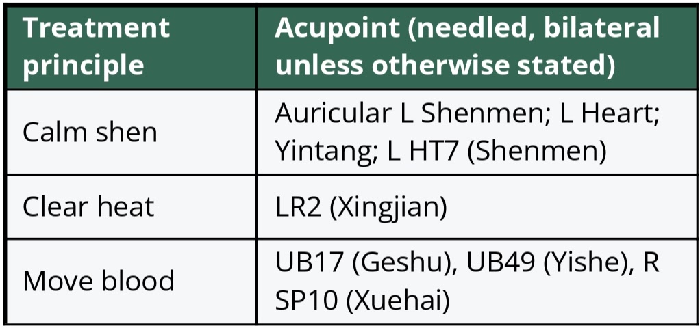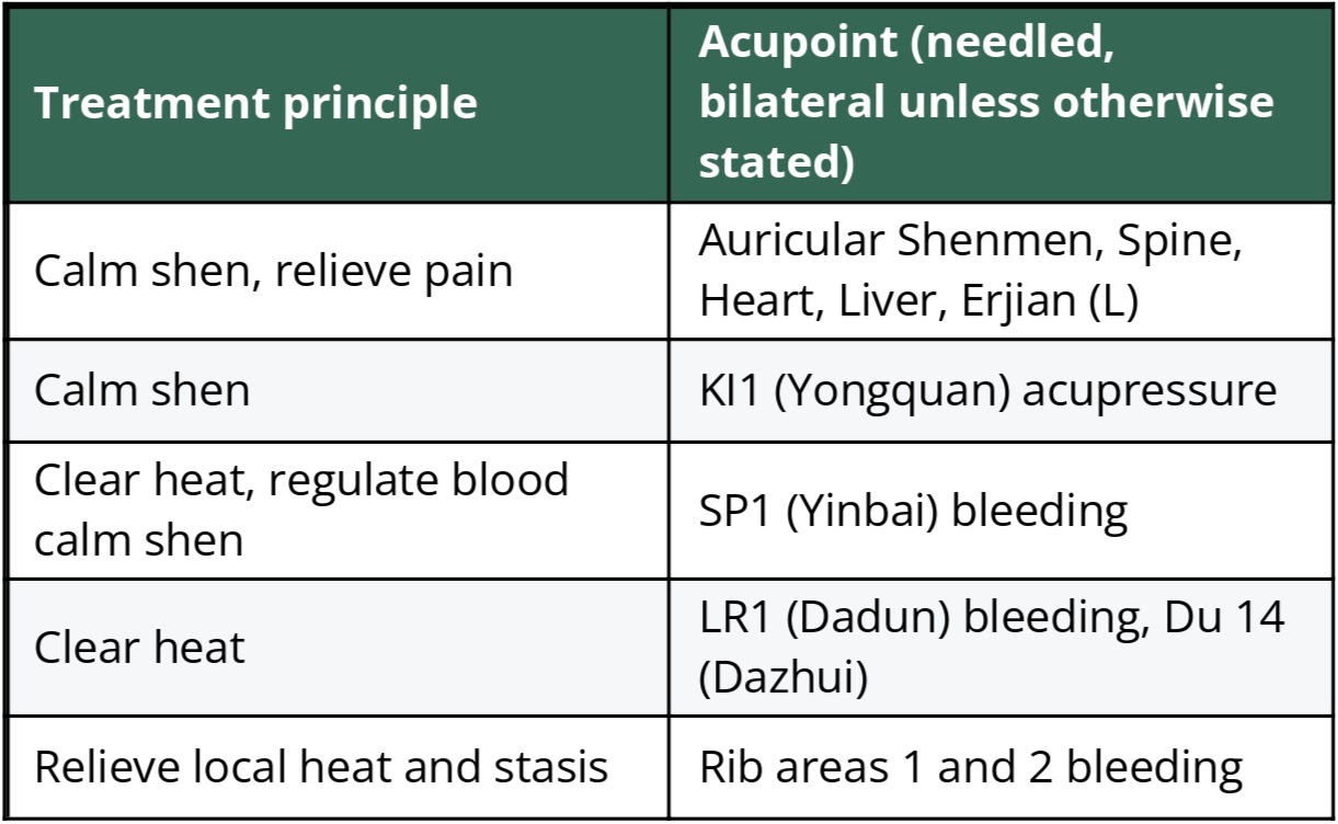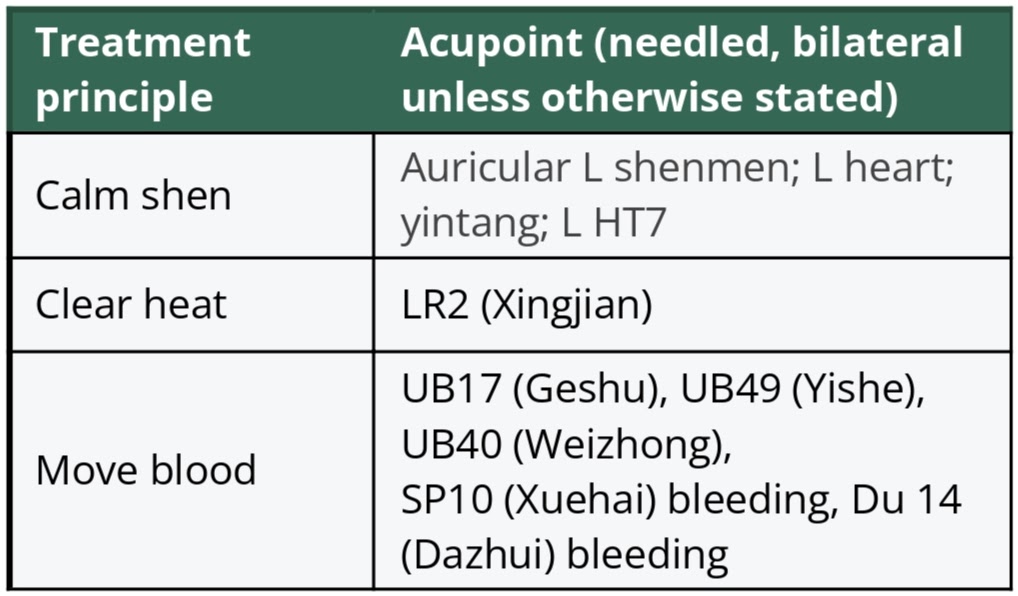 The treatment strategy was to calm the shen, clear heat, and move blood to relieve stasis and pain. Treatment had to occur in an order that reduced pain before touching high-pain areas. Calming and soothing came first to help the patient relax.
