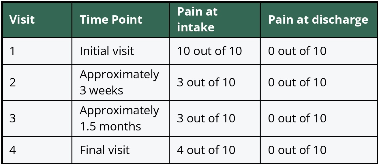 During the initial visit, the patient reported experiencing severe pain rated at 10 out of 10. Following treatment, pain decreased to 0 out of 10. The patient also reported sleeping restfully without discomfort.