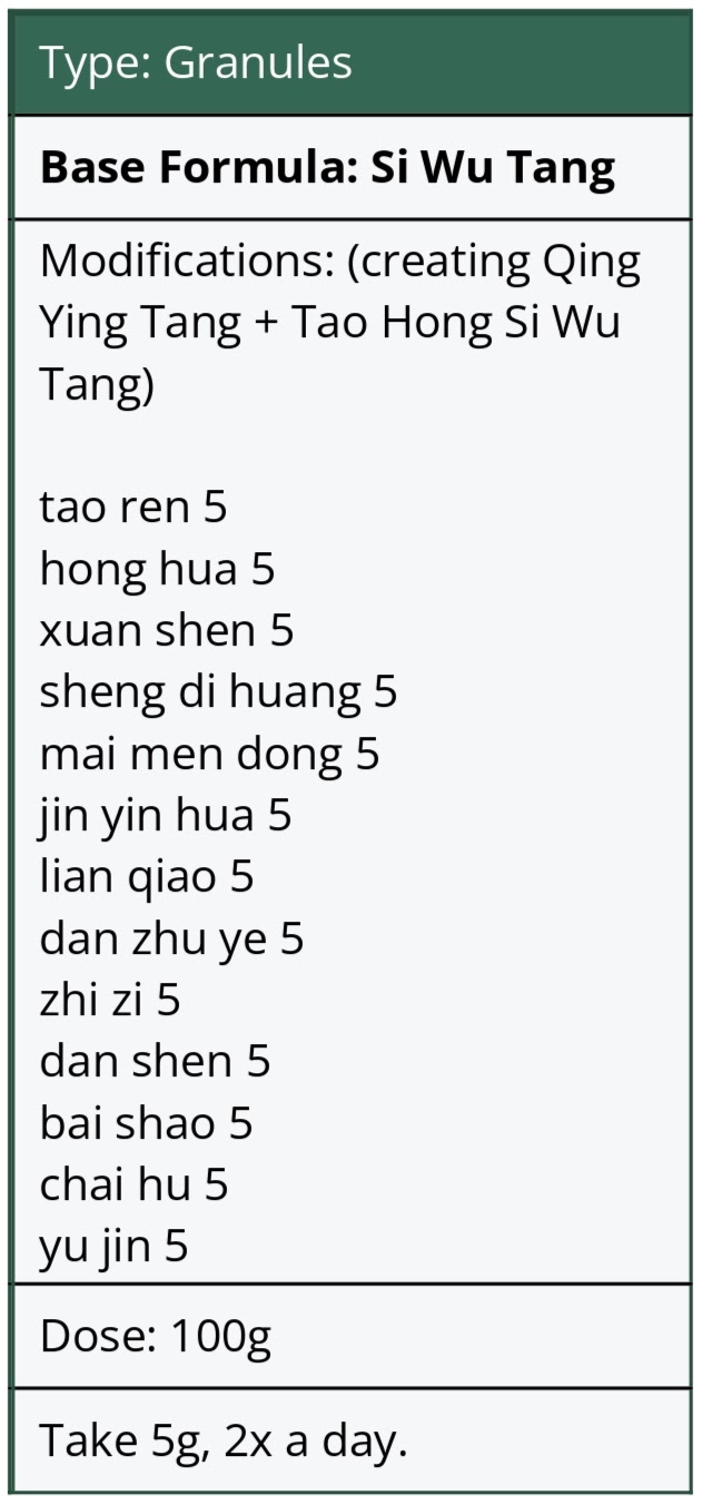 At the third treatment session, the therapeutic strategy continued to focus on clearing systemic heat cooling and moving blood to relieve pain; and soothing Liver qi. Acupuncture was administered as outlined in the treatment table, and the patient was prescribed a personalized Chinese herbal medicine formula in granule form. The base formula was Si Wu Tang, modified to incorporate elements of Qing Ying Tang and Tao Hong Si Wu Tang.