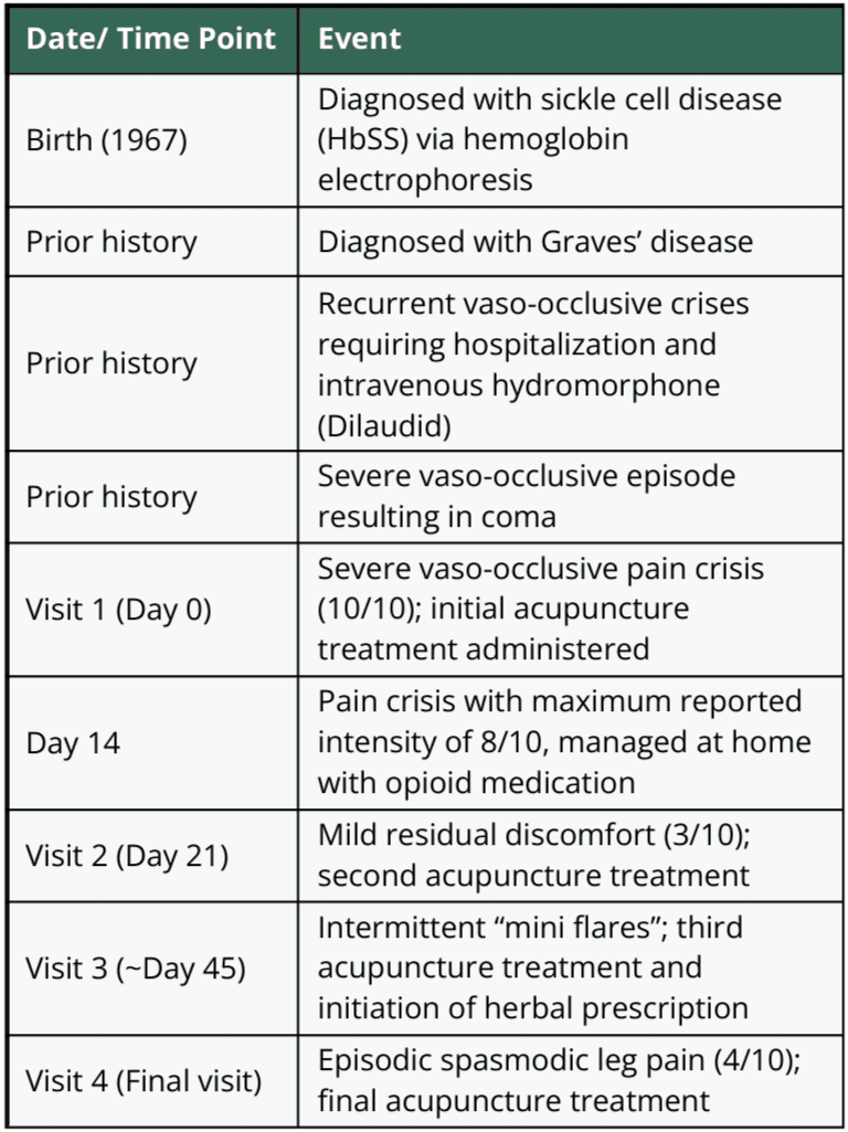 Chronic pain management in SCA often relies on opioids. Black patients and other marginalized groups frequently face barriers to pain care including undertreatment and bias in clinical settings (Arzoun et al., 2022; Hoffman et al., 2016; Anderson et al., 2023). In this case, acupuncture was offered as an option to complement opioid therapy to manage the sickle–cell–related pain of a patient with intersecting marginalized identities. Their experience demonstrates how integrative therapies can be part of a broader strategy for patient-centered and inclusive care.