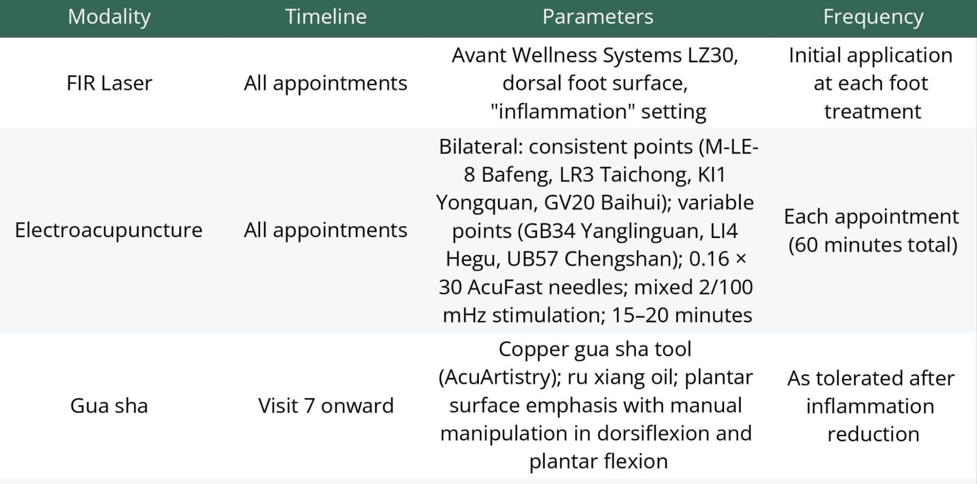 Acupuncture points used consistently bilaterally were M-LE-8 (Bafeng), LR3 (Taichong), KI1 (Yongquan), and GV20 (Baihui); GB34 (Yanglinguan), LI4 (Hegu), and UB57 (Chengshan) were used often but not at every appointment. Needling was performed by a practitioner trained primarily in TCM with more than 10 years of experience. De qi was sought without necessarily using full-depth insertion, using AcuFast 0.16 × 30 needles. Electrostimulation leads were placed, connecting LR3 to a Bafeng point and KI1 to another Bafeng point. The specific combination of Bafeng and channel points varied from appointment to appointment. Electrostimulation was maintained for approximately 15–20 minutes bilaterally using mixed 2/100 mHz settings on a Pantheon Research 8c Pro Electro-Acupuncture Stimulator. Appointments totaled 60 minutes, including preparation and other treatment modalities.